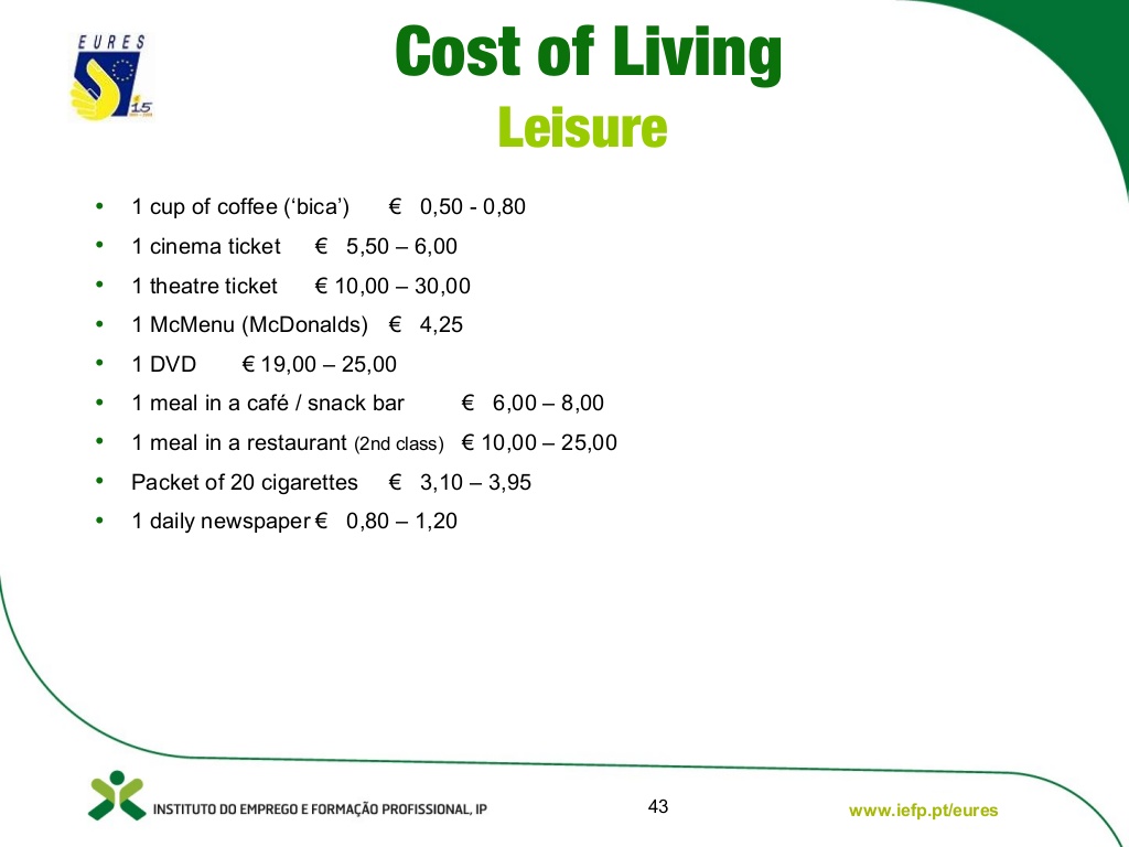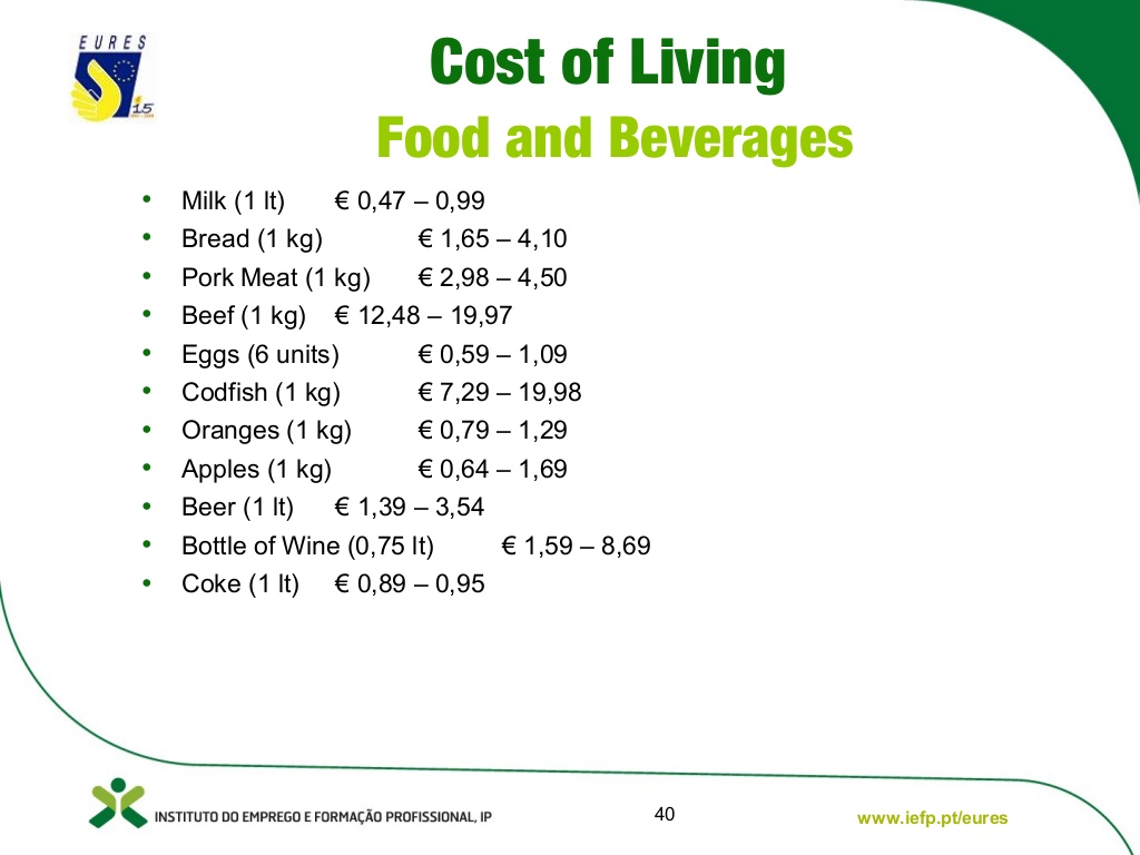 Theo UBS (Prices and Earnings 2015), các chỉ số giá cả hấp dẫn ở Bồ Đào Nha: