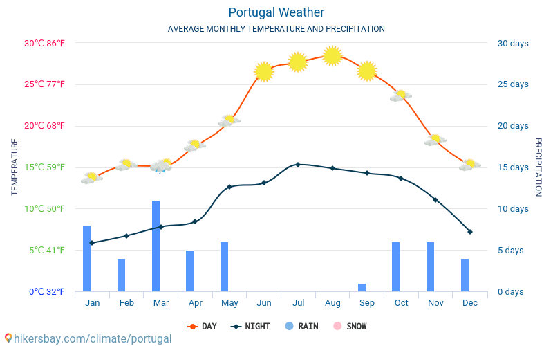 Về khí hậu, mùa đông của Bồ Đào Nha khống quá lạnh, mùa hè nóng và khô. Bạn có biết rằng số giờ nắng mỗi năm đạt giá trị cao tới 3300 giờ ở phía nam của đất nước và 1600 giờ ở phía bắc, một chỉ số cao nhất ở châu Âu?
