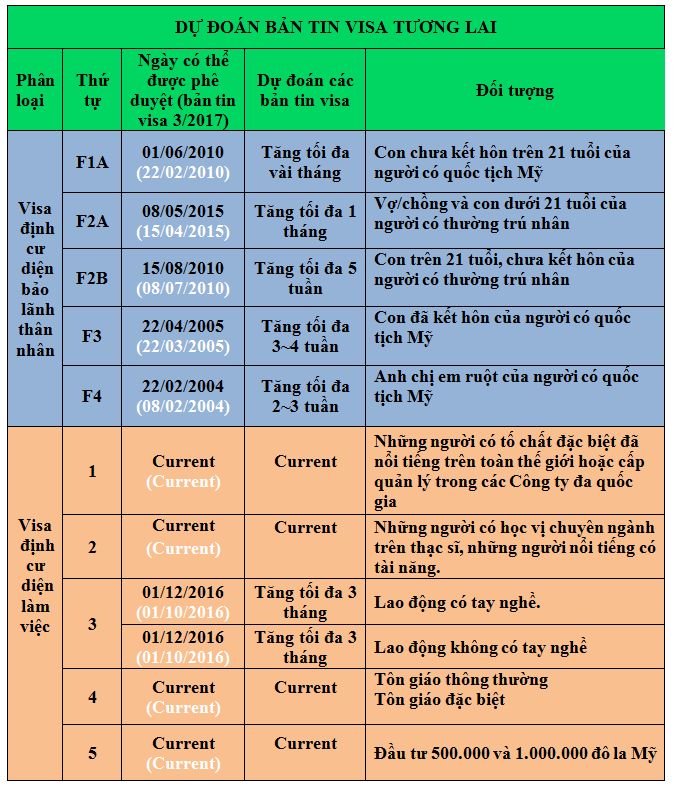 Bộ Ngoại Giao đã dự đoán sơ bộ tình hình bản tin visa cho đến hết năm tài khóa 2017 (tháng 9/2017).