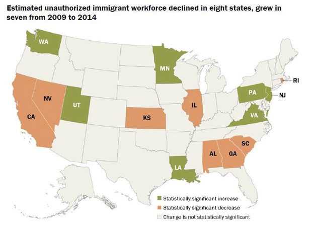 Từ năm 2009 đến 2014, số lượng lao động bất hợp pháp tại 8 tiểu bang bao gồm California, Georgia và Nam Carolina đang giảm dần. Trong khi 7 bang bao gồm Pennsylvania và New Jersey lại đang gia tăng số lượng dân nhập cư bất hợp pháp.
