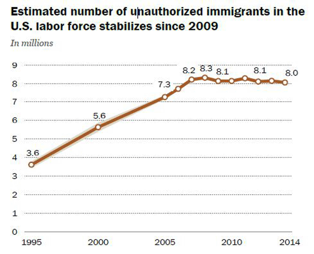 Trong năm 2014, khoảng 8 triệu người nhập cư trái phép đang làm việc tại Mỹ, con số này năm 2008 là 8,3 triệu và năm 2009 là 8,1 triệu. Kể từ năm 2009, trong thị trường lao động Mỹ, tỷ lệ nhân công là những người được sinh ra tại Mỹ hoặc những người nhập cư hợp pháp làm việc tại Mỹ tăng 2.2%, đồng nghĩa với tỷ lệ những người lao động bất hợp pháp đang ngày càng giảm.