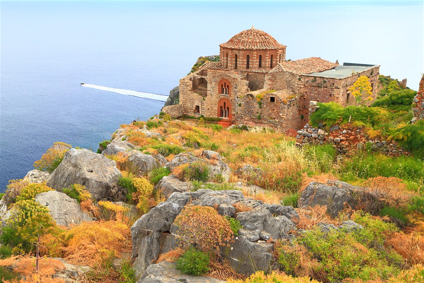 Bạn phải leo theo vòng tròn xung quanh mép của một hòn đá cao chót vót, để đến với ngôi làng Monemvasia có tường bao quanh. Đi theo biển chỉ dẫn để đến với tàn tích của một pháo đài, được xây dựng bởi người Venezia vào thế kỷ 16, và Nhà thờ Byzantine của Agia Sophia, nằm lơ lửng trên rìa vách đá.