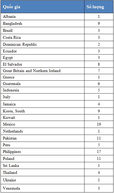 Dưới đây là thống kê số lượng Thị thực định cư điện làm việc EW3, bao gồm cả người hôn phối, và con cái đi kèm được cấp trong tháng 01/2019 theo từng quốc gia.