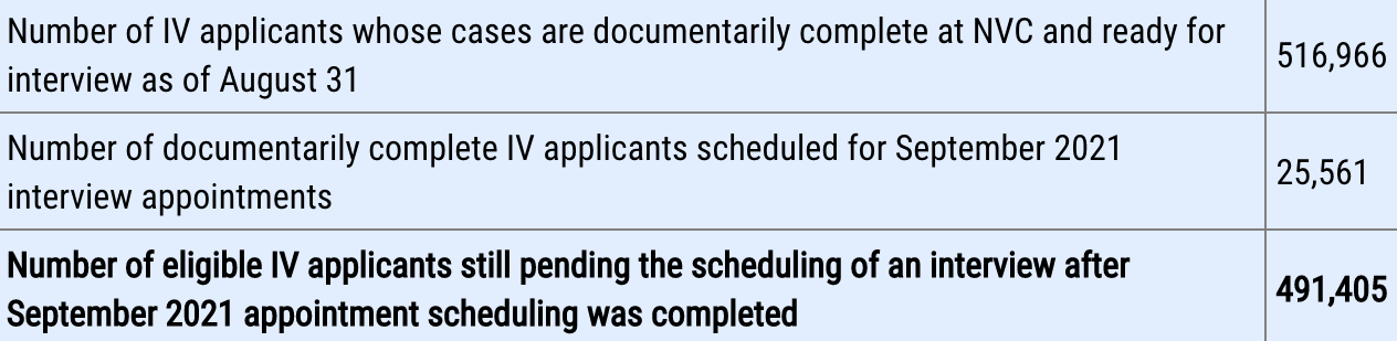Tổng số người nộp đơn vẫn đang chờ Bộ Ngoại giao Hoa Kỳ lên lịch phỏng vấn thẻ xanh của họ đã giảm vào tháng 9, nhưng số lượng người nộp đơn đã được lên lịch phỏng vấn thẻ xanh cũng giảm, một dấu hiệu cho thấy Bộ Ngoại giao không theo kịp tốc độ để giảm tổng thể số hồ sơ tồn đọng.