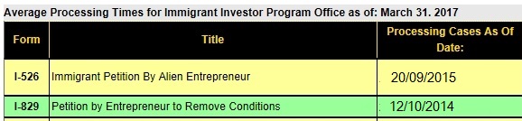 Theo bảng dưới đây, thời gian chờ đợi kết quả đơn I-526 mất khoảng  1 năm 8 tháng.  Nghĩa là những đơn I-526 đang được xét duyệt hiện nay là những đơn đã nộp cách đây 1 năm 8 tháng.