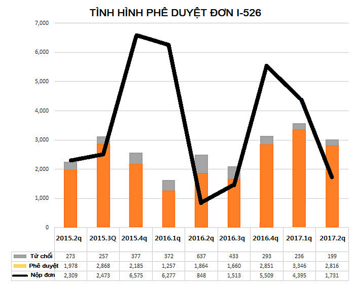 Nhìn biểu đồ trên ta có thể thấy quý 2 của năm tài khóa 2017 ( từ tháng 1 – tháng 3/2017) có 1,731 đơn I-526 được nộp. Cũng trong quý 2 này Sở Di Trú đã phê duyệt 2,816 và từ chối 199 đơn I-526.