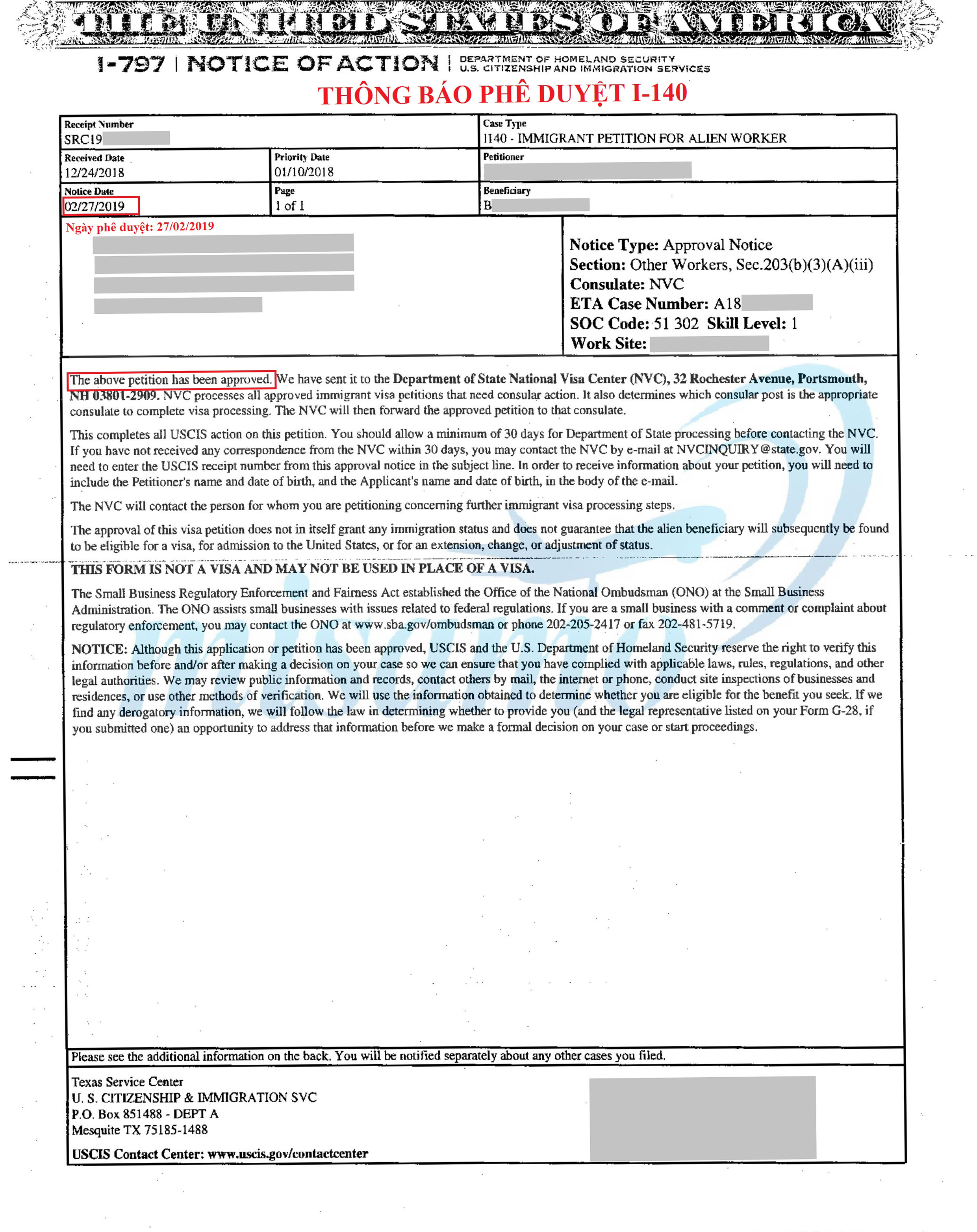 Khách hàng được phê duyệt đơn I-140 vào tháng 02/2019.