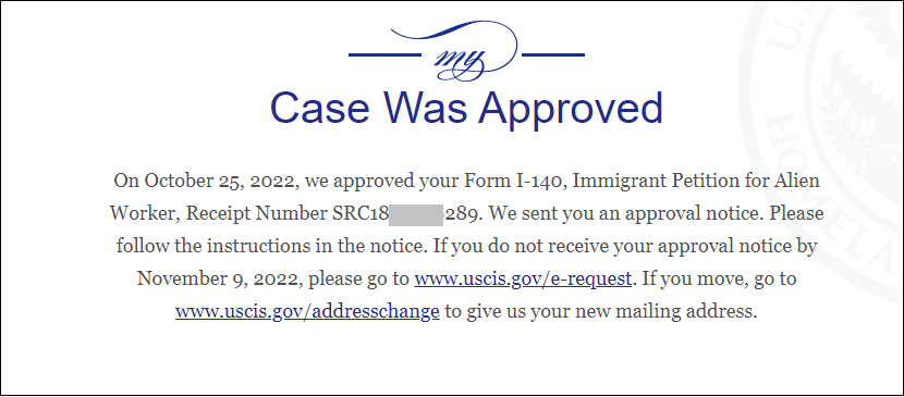 Sở Di Trú tiếp nhận đơn xin định cư I-140 ngày 06.04.2018. Ngày 17.10.2022: Sở Di Trú tiếp nhận yêu cầu phê duyệt nhanh (Premium Processing Service) và đến ngày 25.10.2022 Sở Di Trú chính thức phê duyệt đơn.