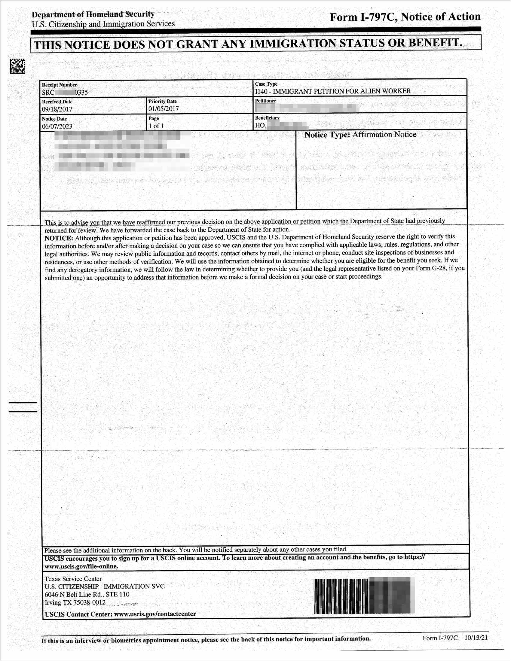 Ngày 07.06.2023, khách hàng HO (SRC*0335) một khách hàng EW3 ( Lao động định cư không tay nghề) người Hàn Quốc của công ty Misamo đã được tái phê duyệt sau khi trải qua quá trình TP kiểm tra hồ sơ ( Reaffirmed: tái xác nhận) tại Sở Di Trú Hoa Kỳ. Hồ sơ đã được chuyển sang NVC vào ngày 09.06.2023